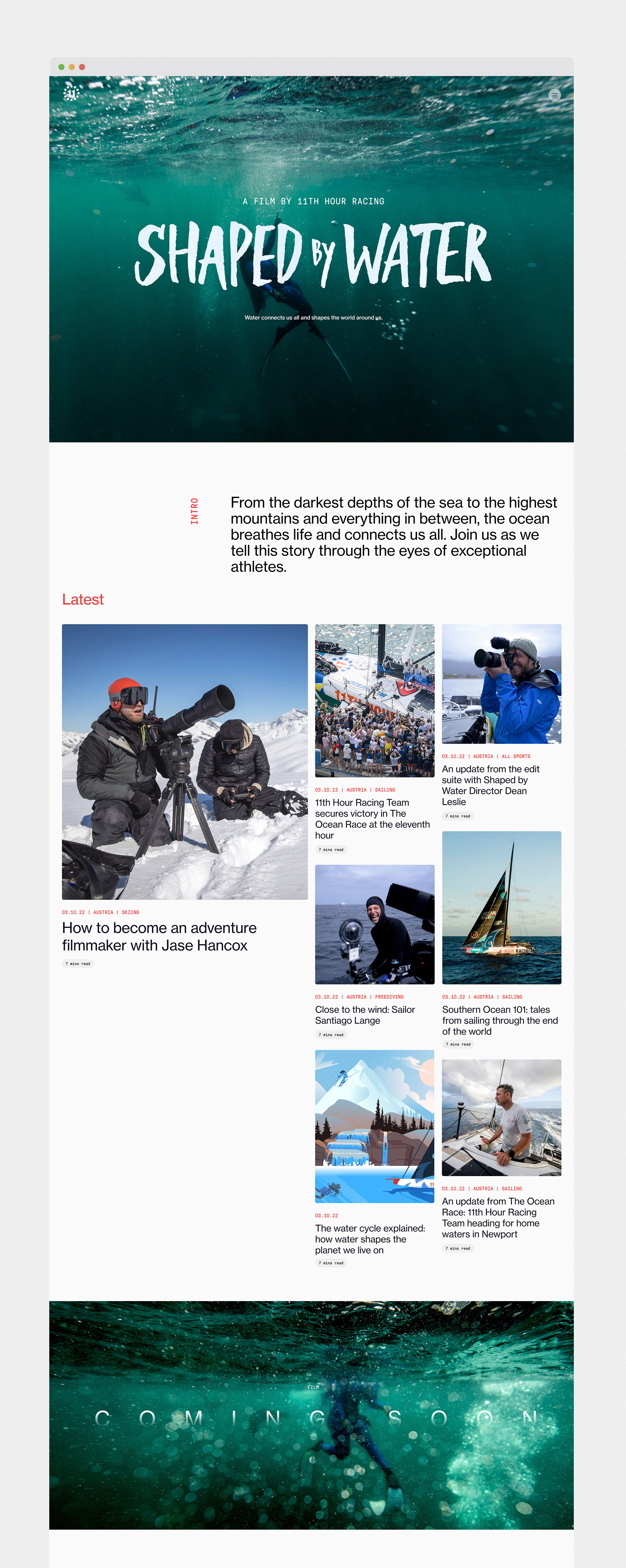 "Shaped by Water" is a visually striking creative hub showcasing 11th Hour Racing's jaw-dropping collection of photos, videos, and epic storytelling. Dive deep into the sea, climb the highest peaks, and soak in the essence of water as you embark on this mind-blowing cinematic site.